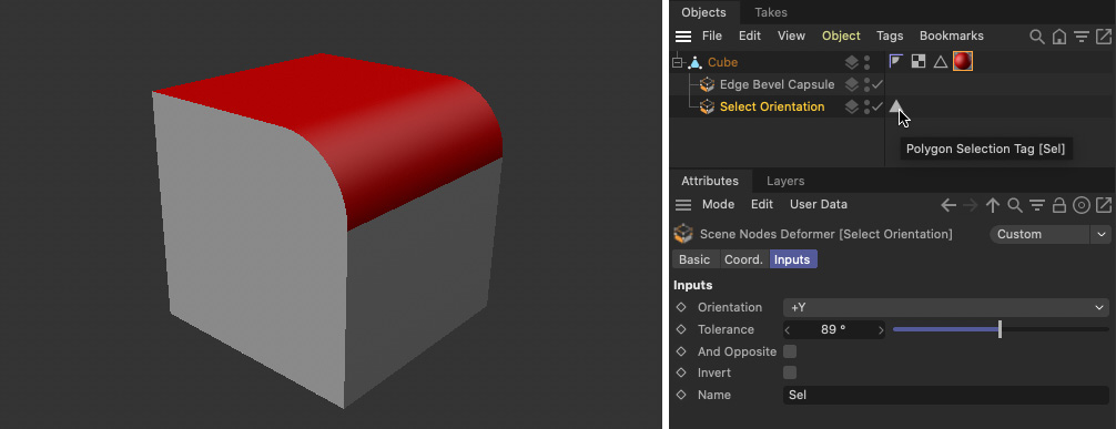Le principe décrit en détail ci-dessus peut également être appliqué à d'autres types de capsules, comme le "Groupe de modificateur de sélection", avec lequel nous pouvons effectuer des sélections de points, d'arêtes ou de polygones. Il peut également être utilisé pour enregistrer des sélections sous un nom, qui peut être transféré à des objets classiques dans le gestionnaire d'objets. Pour le démontrer, nous allons utiliser la fonction "Sélectionner un polygone" et ajouter l'option d'inverser et d'enregistrer la sélection.