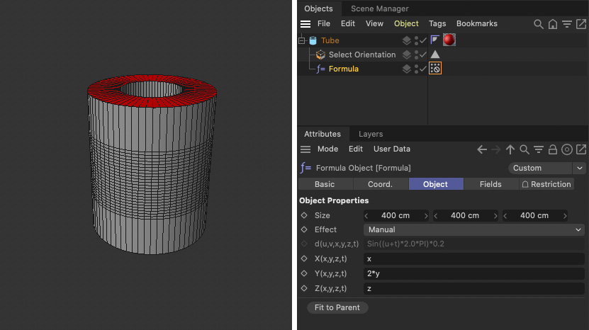 Comme vous pouvez le constater, la propriété caractéristique d'une sélection de polygones apparaît directement derrière la capsule de sélection dans le gestionnaire d'objets. Le nom de cette sélection peut être utilisé directement pour un matériau ou, par exemple, il peut être utilisé pour contraindre des déformations, comme le montre l'image ci-dessous. Ici, la sélection sur l'objet tube n'est pas seulement utilisée pour un matériau, mais avec une propriété "Restriction" également pour une formule de déformation avec la formule Y(x,y,z,t) = 2*y, qui décale les surfaces du bouchon vers l'extérieur. De cette façon, les segments le long de la hauteur restent limités au centre du tube paramétrique.