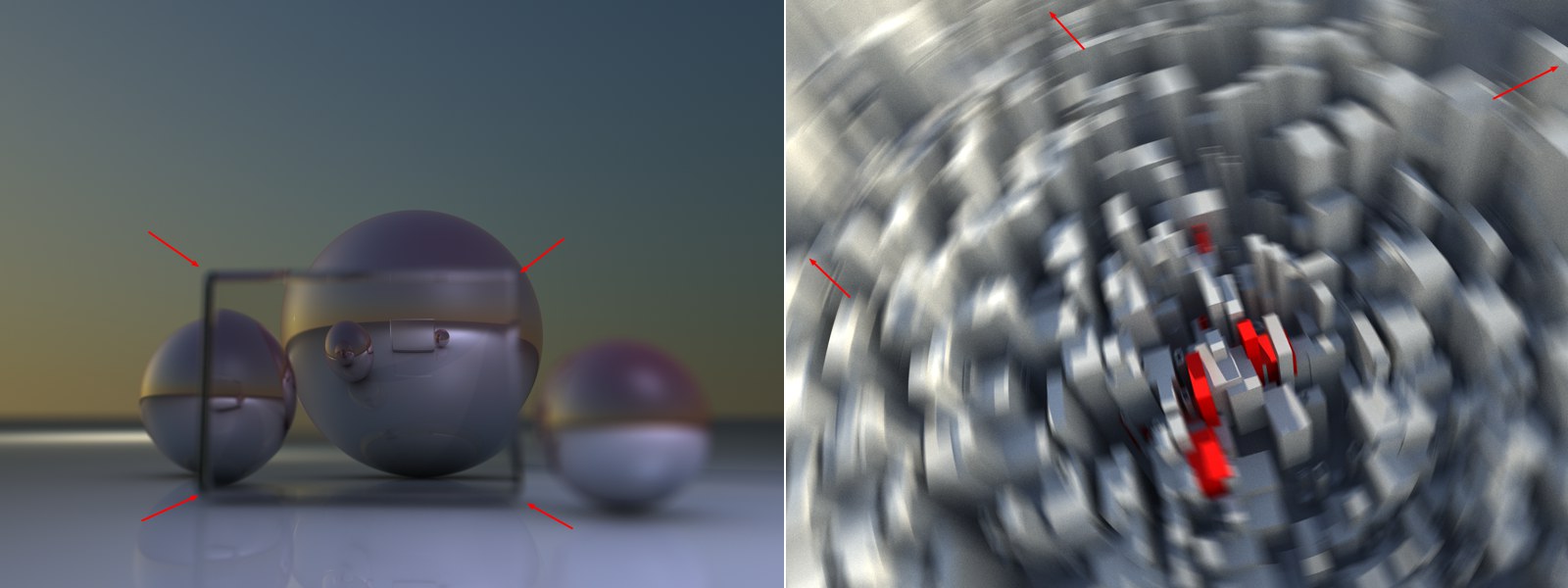 - Gauche : vous pouvez voir un Cube de verre placé devant plusieurs Sphères. Le Cube en lui-même est flou mais le reflet de la Sphère derrière est net. Si un effet de post-production 2D est appliqué en plus de la Profondeur de champs, aucune information sur l’objet derrière la transparence ne sera prise en compte. Tout ce qui se trouvera derrière le Cube de verre sera rendu flou.