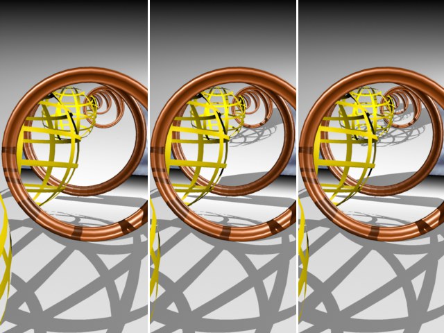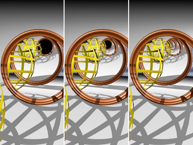 Les scènes ci-dessus, qui contiennent des transparences et des canaux alphas, ont été rendues avec des valeurs maximales de 2, 4 et 8.Vous pouvez entrer des valeurs pouvant aller jusqu'à 500.