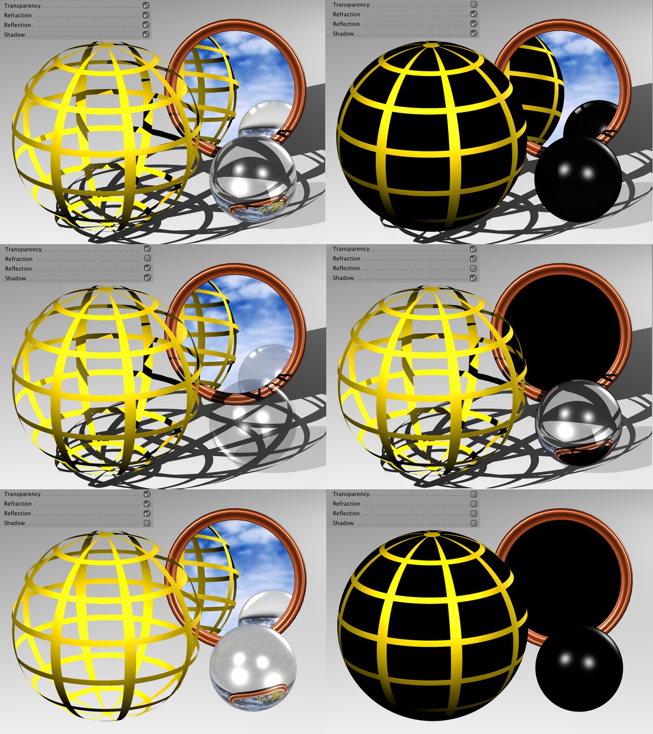 Différents niveaux d'activation de transparence, de réfraction, de réflexion et de l'ombre. Si toutes les options sont désactivées, vous obtiendrez un très rapide calcul mais non réaliste.
