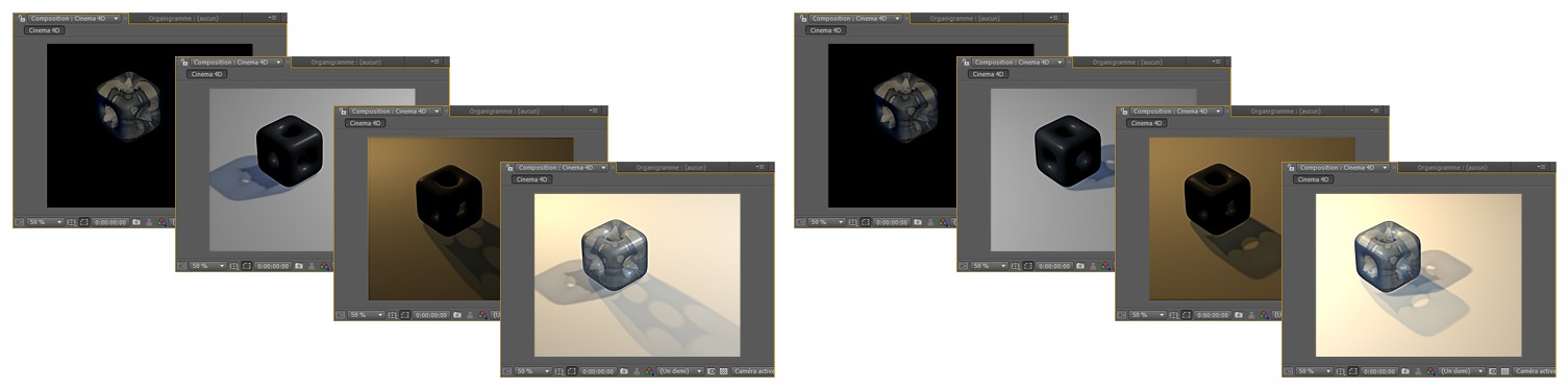 Les programmes de composition vidéo importent les compositions sans ado supplémentaires tant qu’ils se trouvent sur le même ordinateur que Cinema 4D. Avec After Effetcts, le fichier de composition viédo doit se trouver dans le même répertoire que les fichiers qui lui sont reliés. Si ce n’est pas le cas, les images ou les vidéos doivent être remplacées manuellement dans le programme de composition.