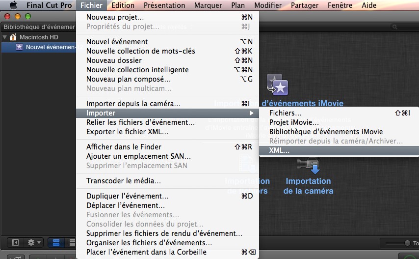 Dans Final Cut Pro, importez le fichier .xml (Fichier / Importation / XML) sans tenir compte de l’alerte affichée.
