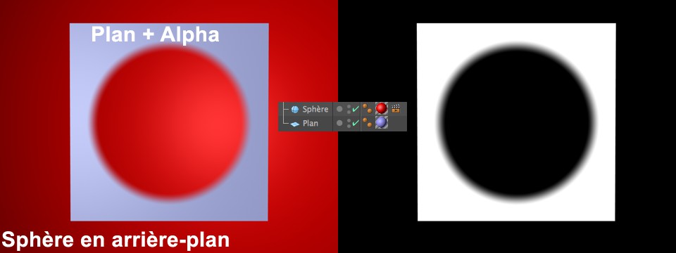 Exemple: Un matériau avec un masque alpha est utilisé pour créer un trou dans un plan dans une grande sphère utilisée pour l’arrière-plan. Le résultat rendu est indiqué à gauche sur l’image ci-dessous. Imaginons que vous voulez maintenant sortir la scène en tant que canal alpha dans lequel seul le plan avec le trou est inclus. Pour ce faire, assignez une propriété Rendu à l’arrière-plan (ici la sphère). Puis désactiver les options Visibilité (caméra) etVisibilité par transparence, afin de créer l'alpha tel que montré sur la droite..