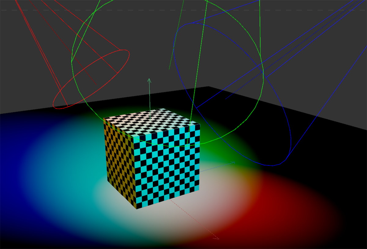 Lors de l'utilisation de plusieurs sources lumineuses de couleurs différentes, la lumière peut, dans certaines circonstances, par exemple, les sources lumineuses plus brillantes que 100 % ou moins de 0 % (sources lumineuses négatives), être rendue différemment. Cela produit des résultats différents, selon que vous visualisez l'image écrasée ou l'image multi-passes compositée.
