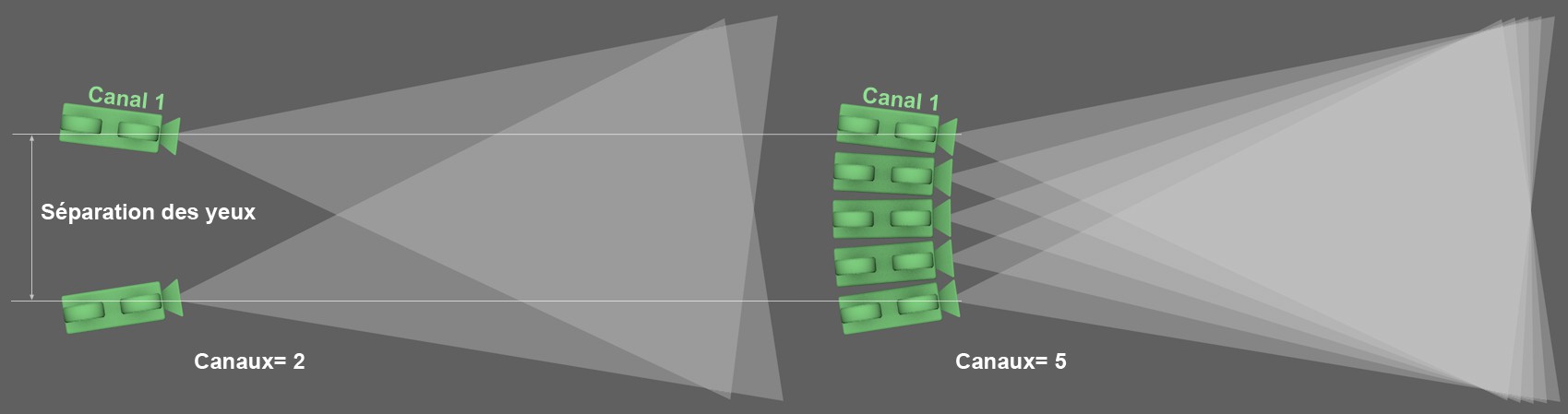 A gauche, une organisation stéréoscopique avec 2 canaux, à droite, une organisation stéréoscopique avec 5 canaux.