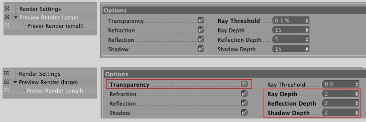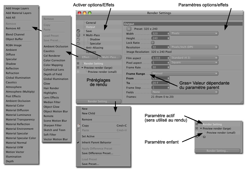 Dans l’exemple ci-dessus un réglage de rendu appelé Preview Render (big) a été créé. Un réglage enfant a été créé en faisant un clic droit et en sélectionnant Nouvel enfant. Ce réglage enfant a été renommé en Preview Render (small). Dans le panneau Option la transparence, la profondeur de réflexion et d’ombres ont été diminués. Ces paramètres sont surlignés en gras (ce qui signifie que ces paramètres ont des valeurs différentes du réglage parent et n’hériteront pas des valeurs du réglage parent).