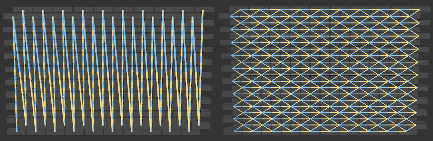 Au fur et à mesure que le rayon de recherche augmente, les corps rigides qui sont spatialement proches les uns des autres seront connectés en premier. Ce mode correspond généralement mieux à la réalité que le mode Index. Imaginez un mur de briques : les différentes briques sont reliées à leurs voisines directes par du mortier ; non seulement à la brique précédente/suivante, mais aussi à la brique supérieure/inférieure. C'est exactement la raison d'être du mode à distance : se connecter localement - comme illustré ci-dessus à droite.