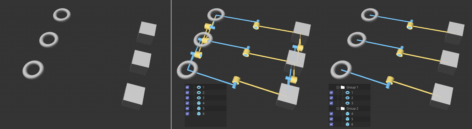 Dans l'illustration ci-dessus, les tores doivent être reliés aux cubes opposés. En mode Distance, le tori et le cube sont aussi initialement connectés l'un à l'autre, car ils sont plus proches que leurs homologues. Si vous placez les deux dans leur propre groupe, les connexions ne se feront qu'avec l'autre groupe.