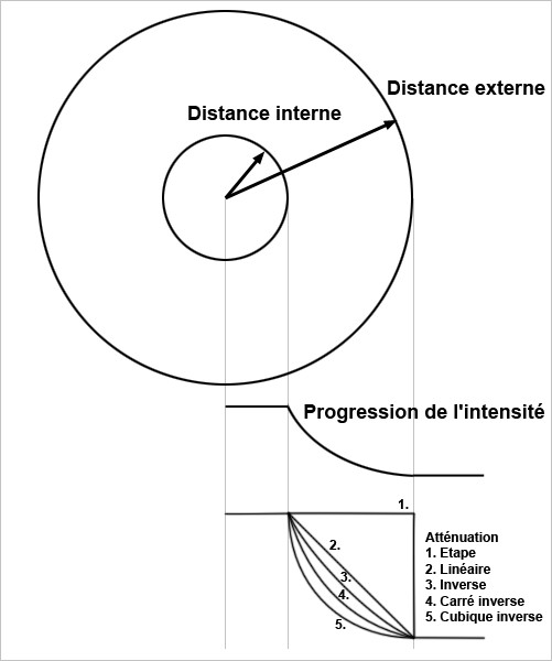 Comme dans la réalité, les forces diminuent avec la distance entre les corps rigides. Vous définissez cette diminution à l'aide des paramètres suivants.