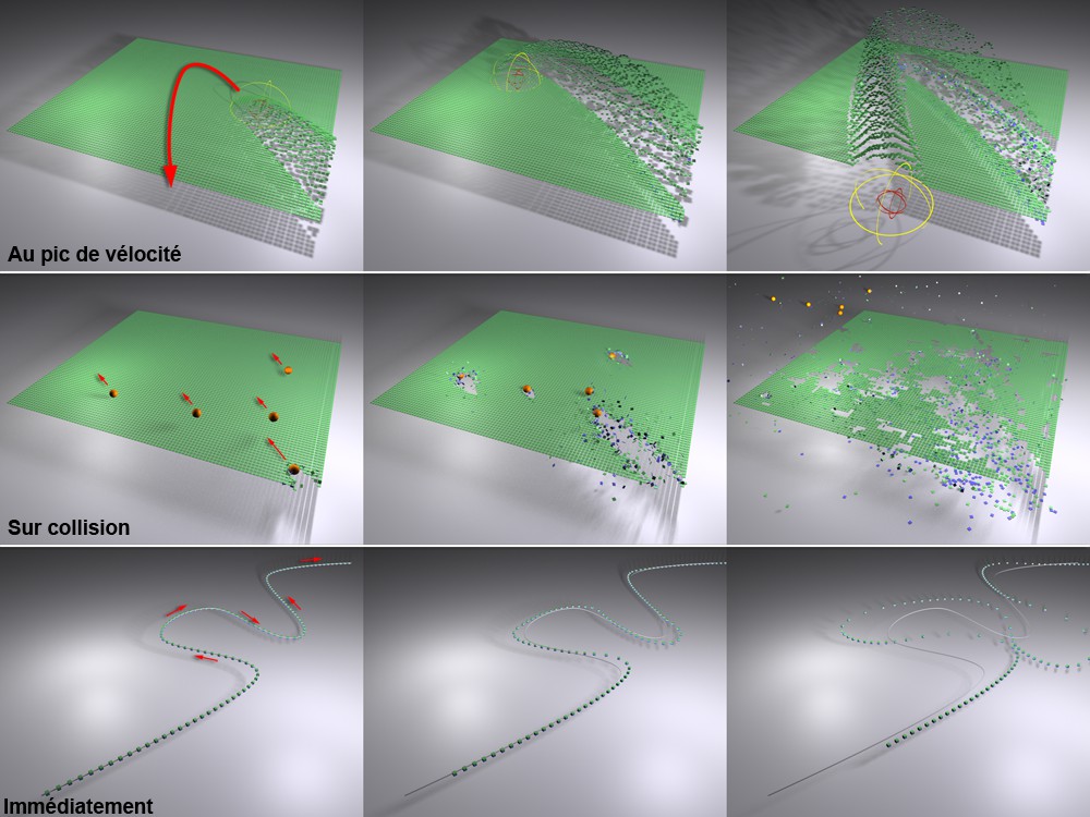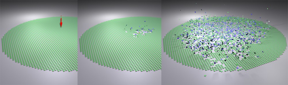Le Déclencheur seuil de vélocité assure que seuls les éléments avec lesquels une collision a lieu seront affectés. En bas, une valeur trop élevée - toute la fenêtre en verre est brisée.