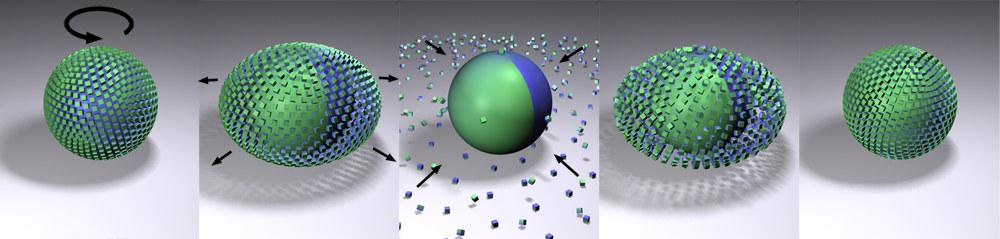 La sphère et les clones tournent; la sphère repousse les clones; l’option Dynamique est ensuite désactivée et les clones reviennent à leur position initiale.