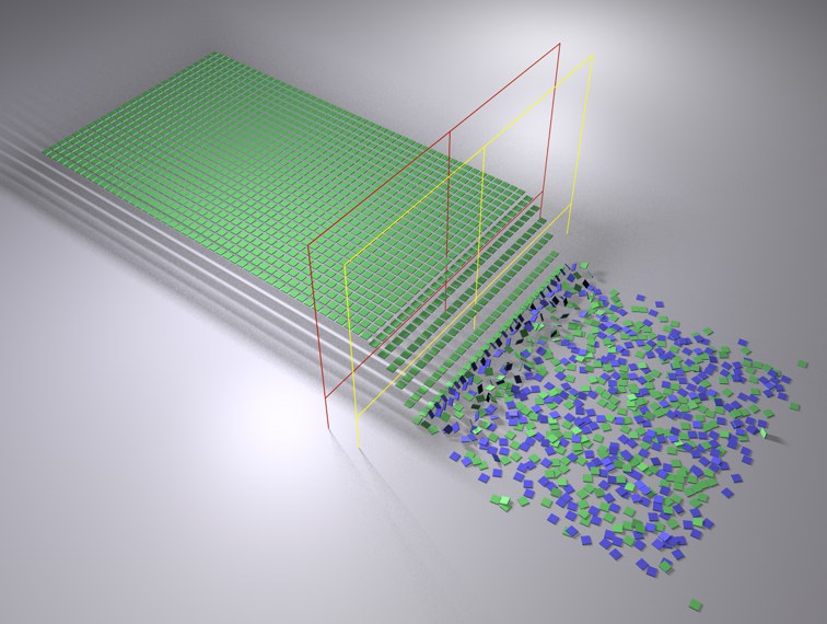 Cela peut, par exemple, être utilisé pour créer des chaînes de réaction comme celle que voyez dans ces expériences élaborées sur les pièges à souris. Dans l'exemple suivant, chaque clone s'est vu attribué une Vélocité linéaire initiale le long de l'axe Y (vers le haut). Déclencher. Si un autre clone est lâché au centre de la construction, la réaction en chaîne sera déclencher sur:
