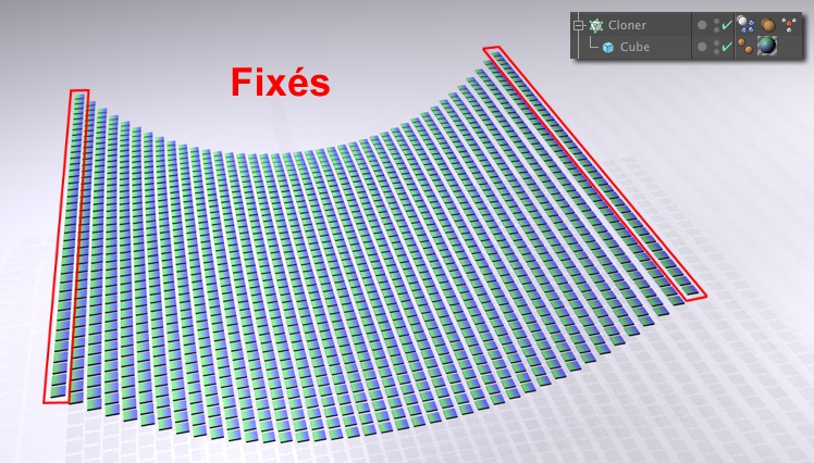 Assurez-vous aussi de ne pas laisser l'Effecteur/Modificateur passer trop rapidement par les clones (en particulier lorsque l'effet de l'Effecteur/du Modificateur est restreint au niveau spatial) car cela peut donner un phénomène paradoxal dû aux larges distances que le champs de force doit parcourir entre les cadres. Cela peut être compensé par l'augmentation de la portée du champs de force.