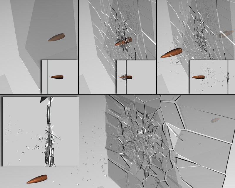 Le Déclencheur seuil de vélocité assure que seuls les éléments avec lesquels une collision a lieu seront affectés. En bas, une valeur est trop élevée. L'ensemble de la fenêtre en verre est brisé.