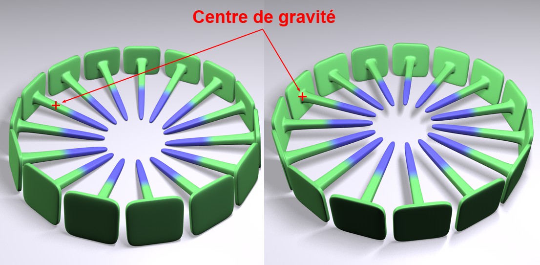 A gauche, le centre de masse a été calculé automatiquement au centre de masse réel; à droite, la tête du clou a été déplacée vers le haut et la tige du clou a été déplacée en conséquence (la gravité tend vers le Centre personnalisé).