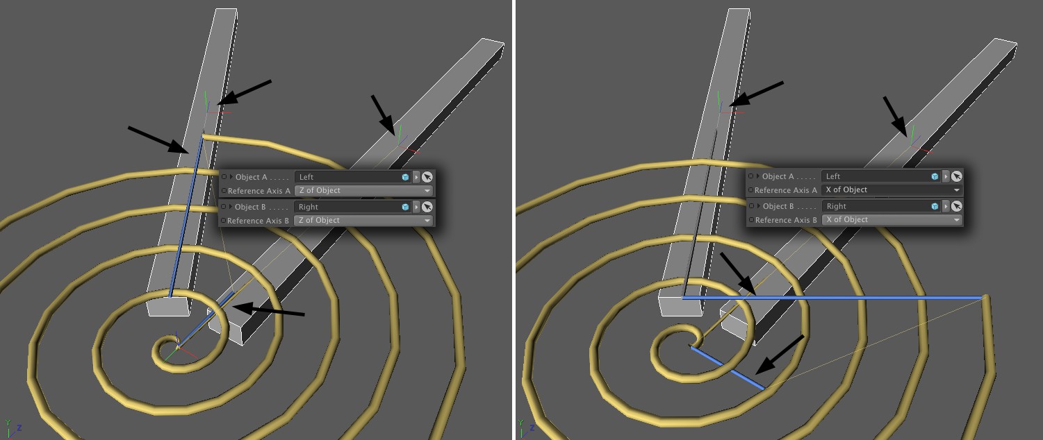 Notez que les deux "extrémités du ressort" bleues sont alignées sur l'axe défini (des objets liés). L'axe objet-Y n'aurait guère de sens dans ce cas.