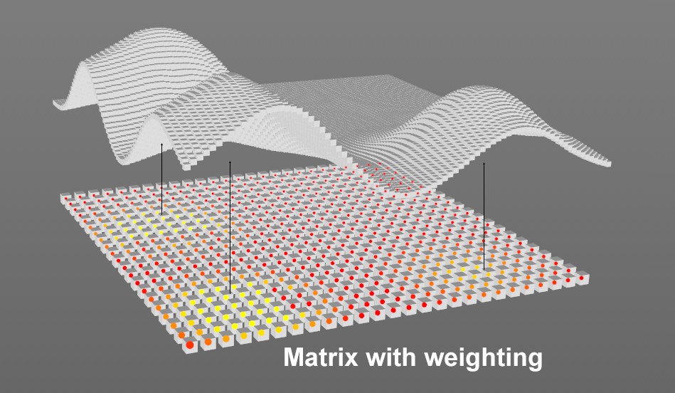 Ici, une matrice (3 champs sphériques définissent l’influence) affecte une seconde matrice via un calque d’objet MoGraph.