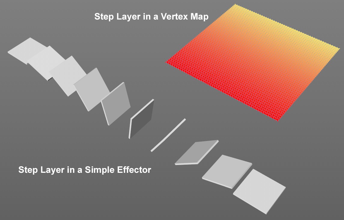 Le Calque Pas génère des valeurs comprises entre 0 et 1 qui peuvent être mélangées avec d’autres Champs et calques de Modificateurs dans leurs listes de champs respectives (par ex. les Effecteurs et les Déformateurs).
