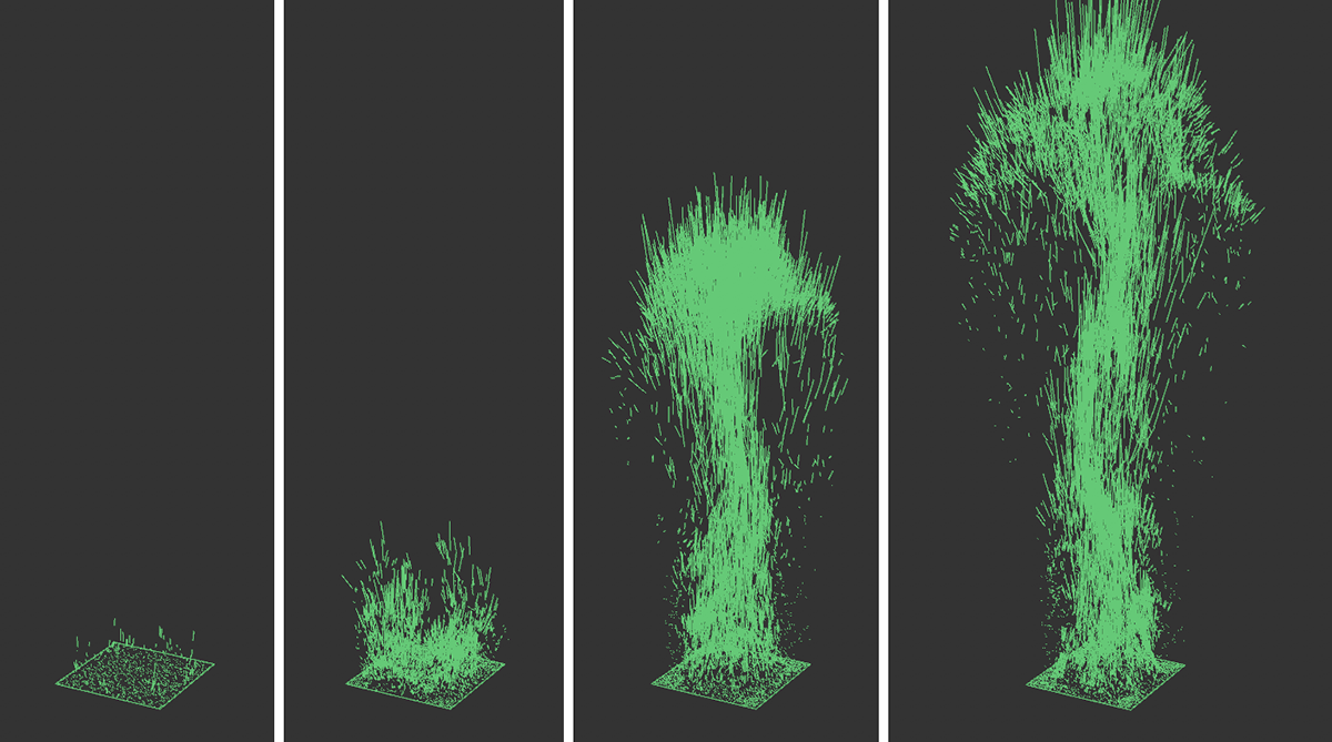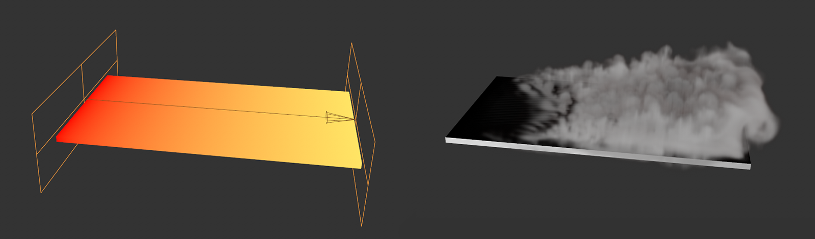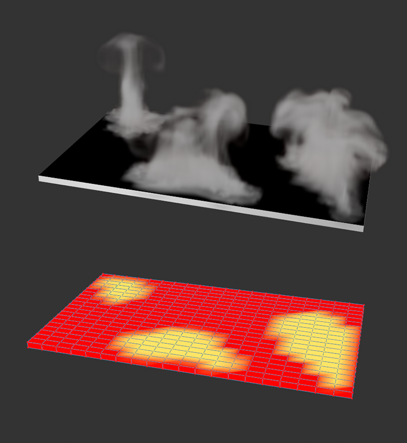 Comme décrit ci-dessus, la simulation nécessite un volume dans lequel le gaz est généré. Par exemple, imaginez cette zone comme la pointe d'une allumette. Là, la friction génère de la chaleur, qui enflamme ensuite le combustible. Une réaction se produit entre l'oxygène et le bois. De la chaleur supplémentaire et, par exemple, de la suie sont générées, qui s'élèvent sous la forme d'un panache de fumée.