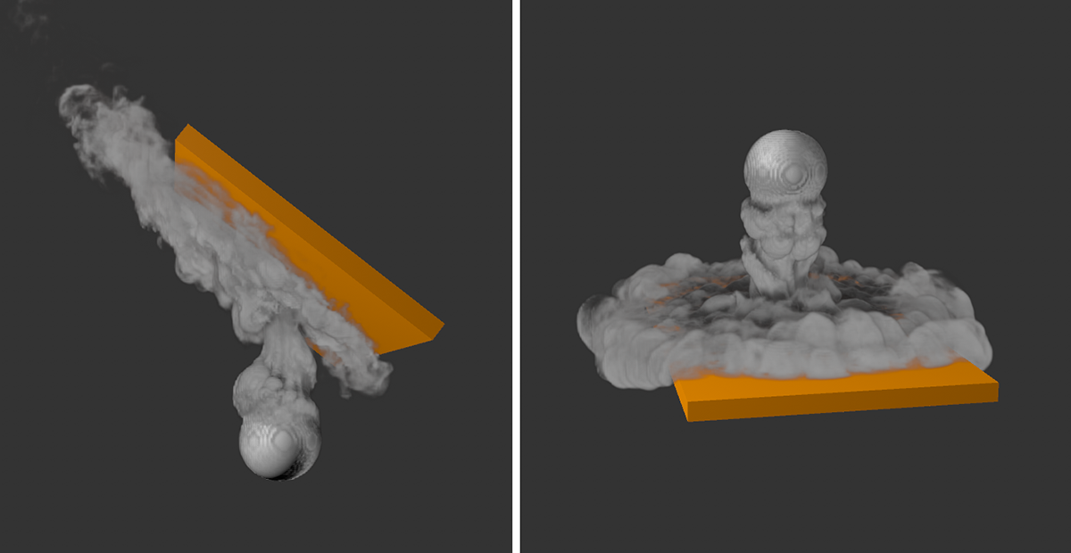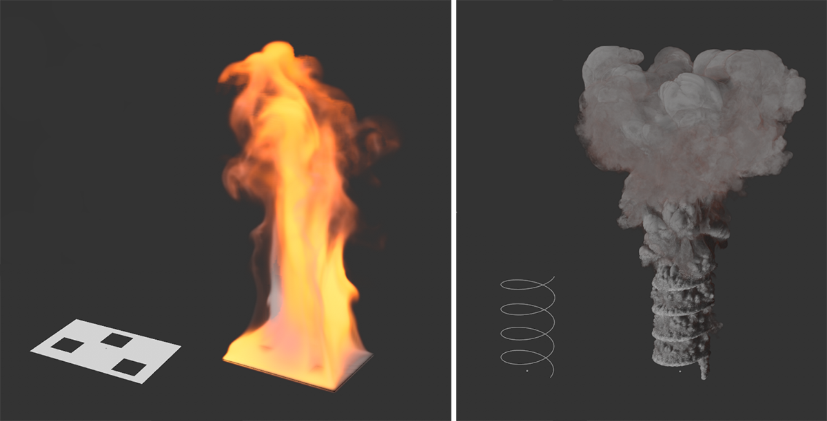 Ici, deux exemples montrent comment la fumée interagit avec un objet de simulation de collision.