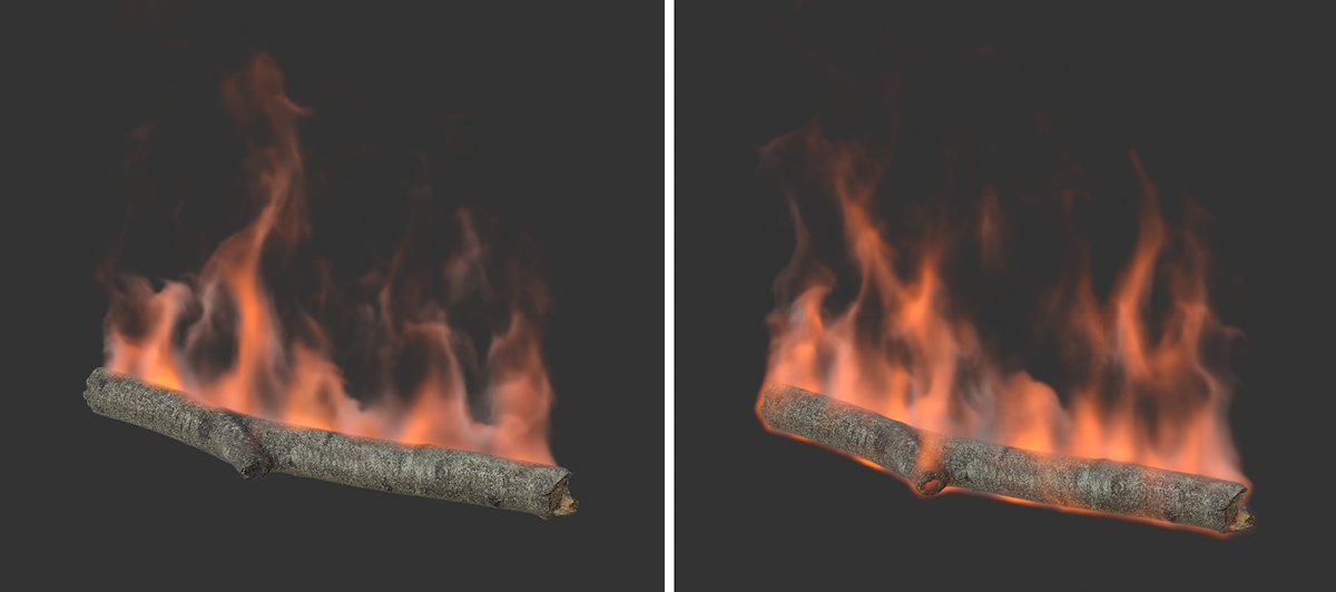 Comme le montre la figure ci-dessus, l'agrandissement de l'émetteur à l'aide de l'option Emetteur Surface peut également permettre de rendre la simulation visible à l'extérieur d'un objet. Dans le cas spécifique de la branche en feu, cela signifie que les flammes semblent également lécher le pourtour de la branche et ne pas seulement sortir par le sommet.