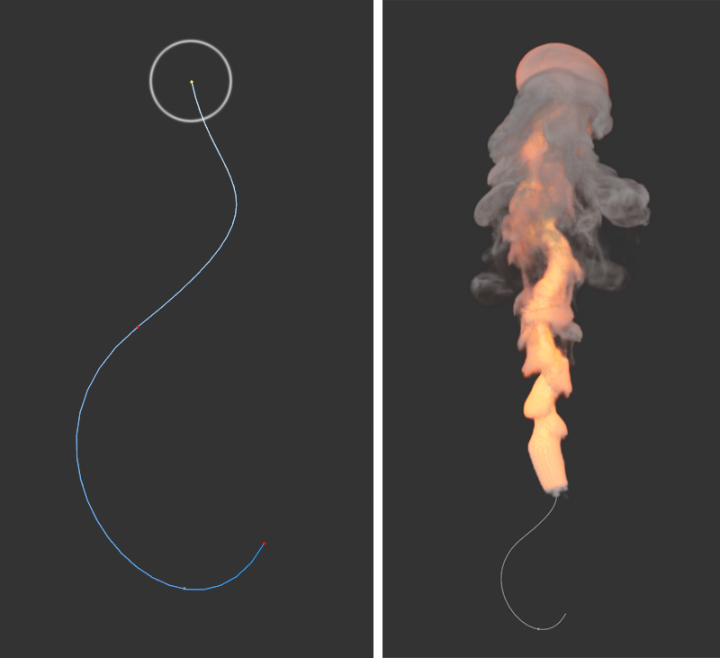 À gauche, vous pouvez voir un gros plan de la spline utilisée comme émetteur. Le cercle en haut marque le point de la spline qui a été pondéré à 100% dans la carte d'influence de points. À gauche, le résultat de la simulation, qui produit de la fumée et de la chaleur uniquement au sommet de la spline.