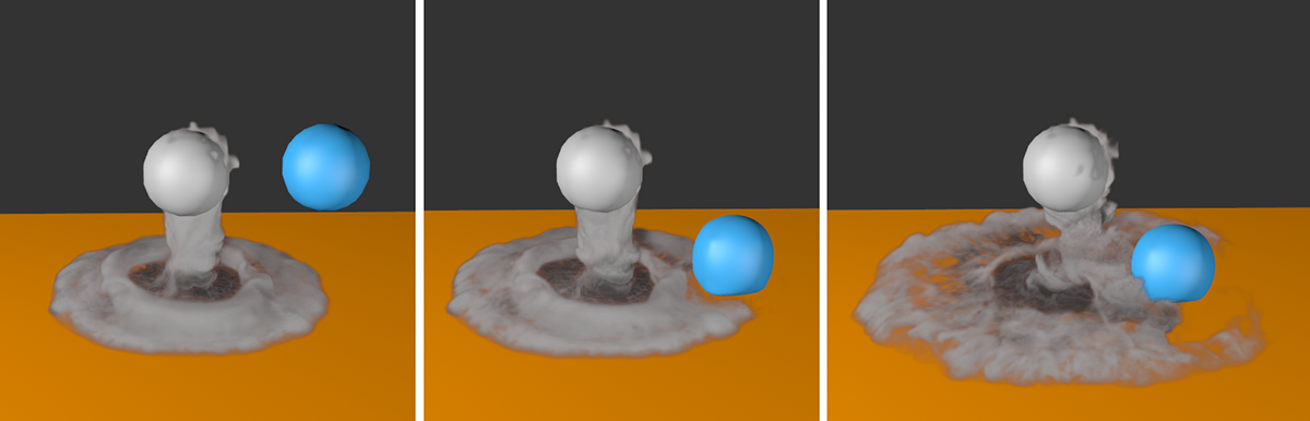 De même, la simulation de fumée ou de feu peut interagir avec les corps souples, par exemple, comme le montre l'exemple suivant. Là, une sphère bleue corps souples tombe sur le plan, repoussant la fumée. Les interactions entre la simulation Pyro et, par exemple, une simulation de corps souples ou de vêtements peuvent également être contrôlées par le paramètre Facteur de force du fluide de l'objet Pyro.