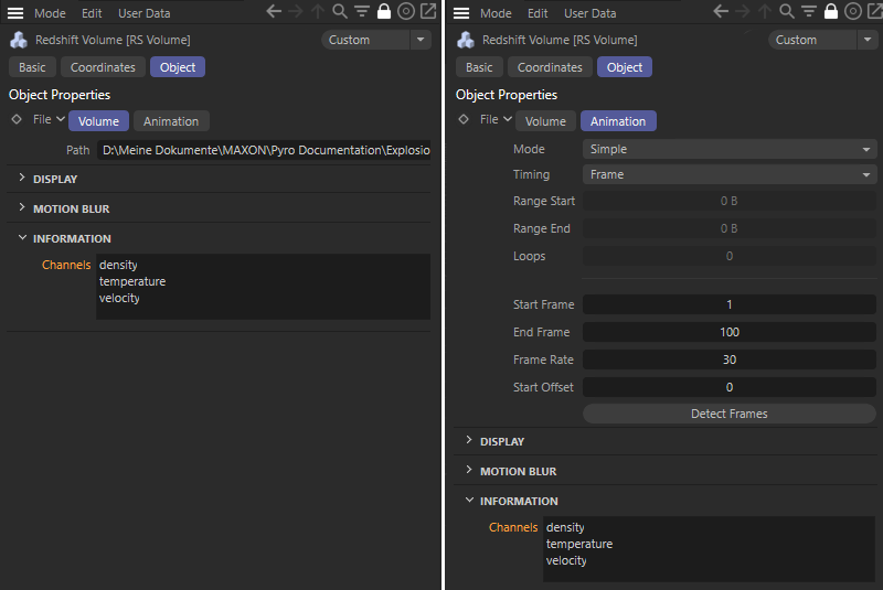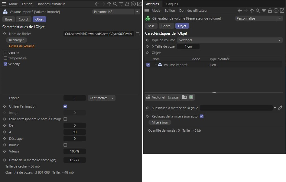 Après avoir défini le chemin d'accès à une séquence VDB (à gauche), sa lecture peut être contrôlée dans l'onglet Animation (à droite). En outre, la zone d'information indique les propriétés des objets contenus dans la séquence VDB.