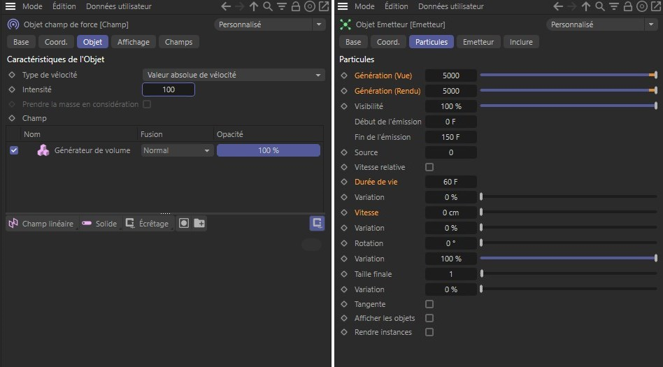 Un objet Champ de force interprète les vecteurs du Générateur de volume comme des vitesses (à gauche), qui peuvent ensuite être transférées aux particules d'un Émetteur standard (à droite).
