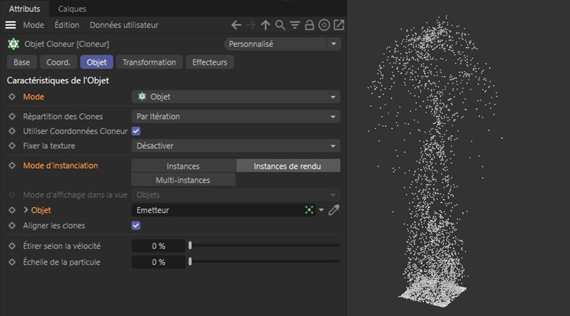 Cependant, vous êtes encore plus flexible si vous créez plutôt un objet MoGraph Cloneur et que vous y activez le mode Objet. L'émetteur peut ensuite être affecté à un objet dans le cloneur. Vous pouvez ainsi utiliser Multi-Instance en mode Instance, ce qui permet d'économiser encore plus de mémoire et d'être plus rapide que Instance de rendu.
