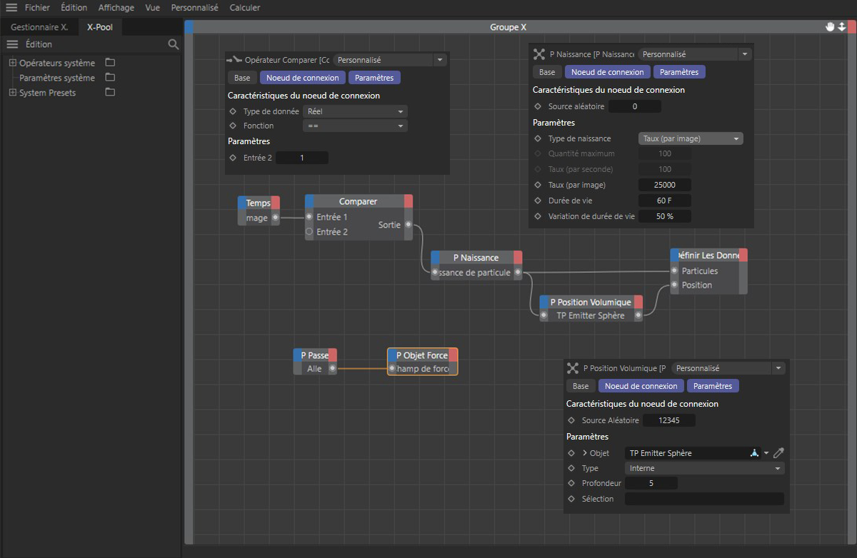 Exemple Circuit XPresso pour créer des Thinking Particles dans le volume d'un objet, puis leur appliquer l'effet d'un objet Champ de force.