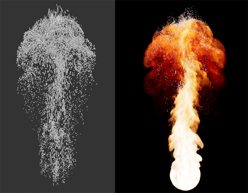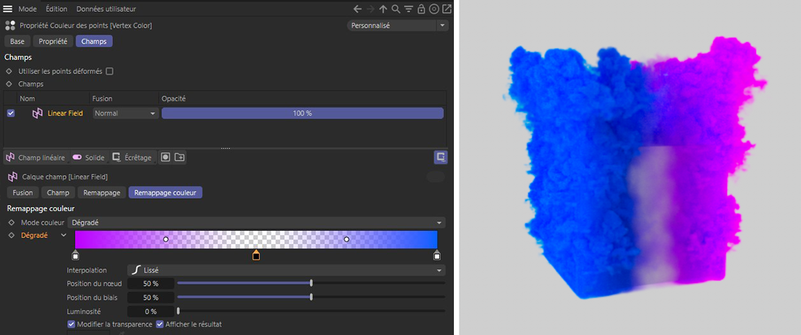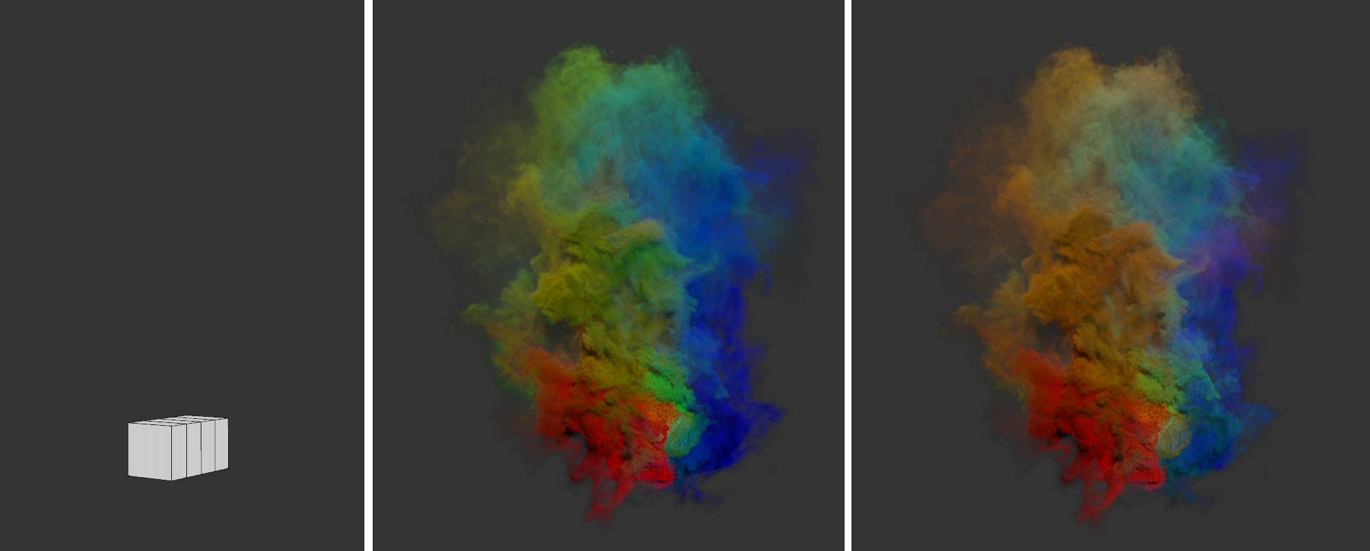 A gauche, vous pouvez voir la rubrique des champs de la propriété Couleur de points. Un champ linéaire en mode dégradé de couleurs a été utilisé pour mélanger les différentes couleurs de manière homogène. En outre, les valeurs alpha ont été définies de manière à ce que l'opacité des couleurs diminue au milieu du dégradé. À droite, le résultat est obtenu après avoir assigné la propriété Couleur des points en tant que Carte de couleur dans la propriété Émetteur Pyro. Seules les simulations de densité et de couleur ont été activées.