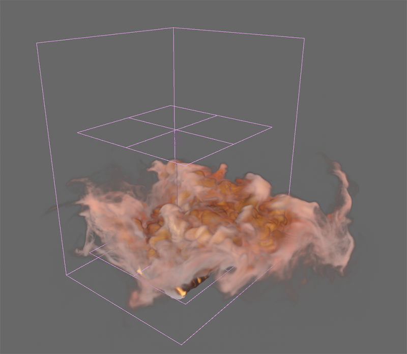 Pour la simulation proprement dite, chaque voxel est à nouveau subdivisé en cubes spatiaux plus petits afin de pouvoir calculer et représenter les flux et tourbillons caractéristiques au sein d'une flamme ou d'une colonne de fumée. Ce faisant, nous obtenons déjà un aperçu significatif de la simulation dans les vues ombrées de l'éditeur lorsque nous jouons la simulation.