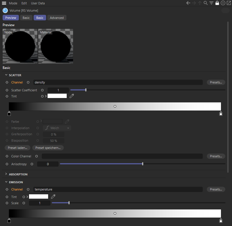 Il est encore plus pratique d'appliquer le matériau Pyro Volume , déjà bien réglé. La saisie des canaux de simulation typiques que sont la density et la temperature s'y fait automatiquement. En outre, la simulation réaliste Black Body pour les couleurs de la distribution de la température est utilisée par défaut.