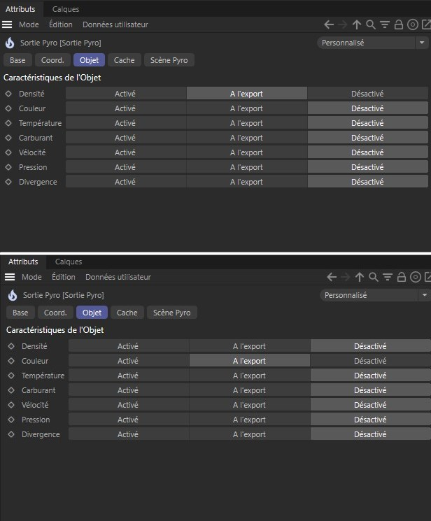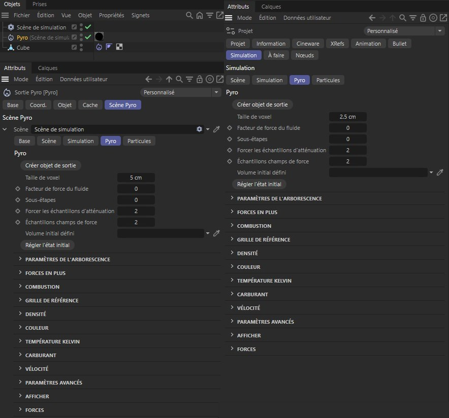 À gauche, les paramètres de simulation sont visibles sur l'objet Sortie Pyro dans le gestionnaire d'attributs. Par défaut, leurs valeurs sont identiques à celles de la catégorie Simulation/Pyro dans les préférences du projet (voir la partie droite de l'image).