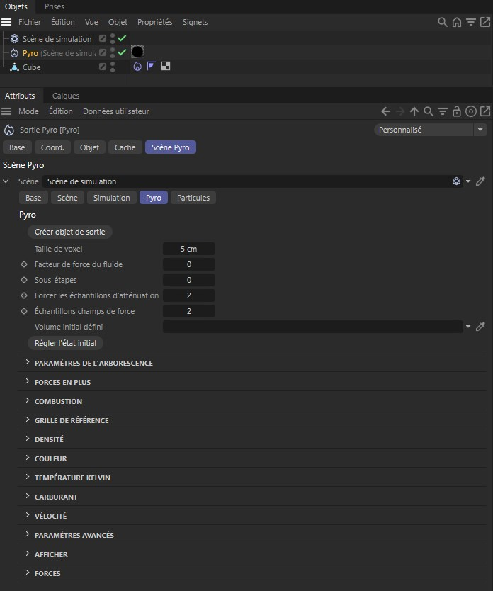 Les paramètres de simulation Pyro d'un objet Scène de simulation peuvent également être utilisés comme scène Pyro sur l'objet Sortie Pyro.