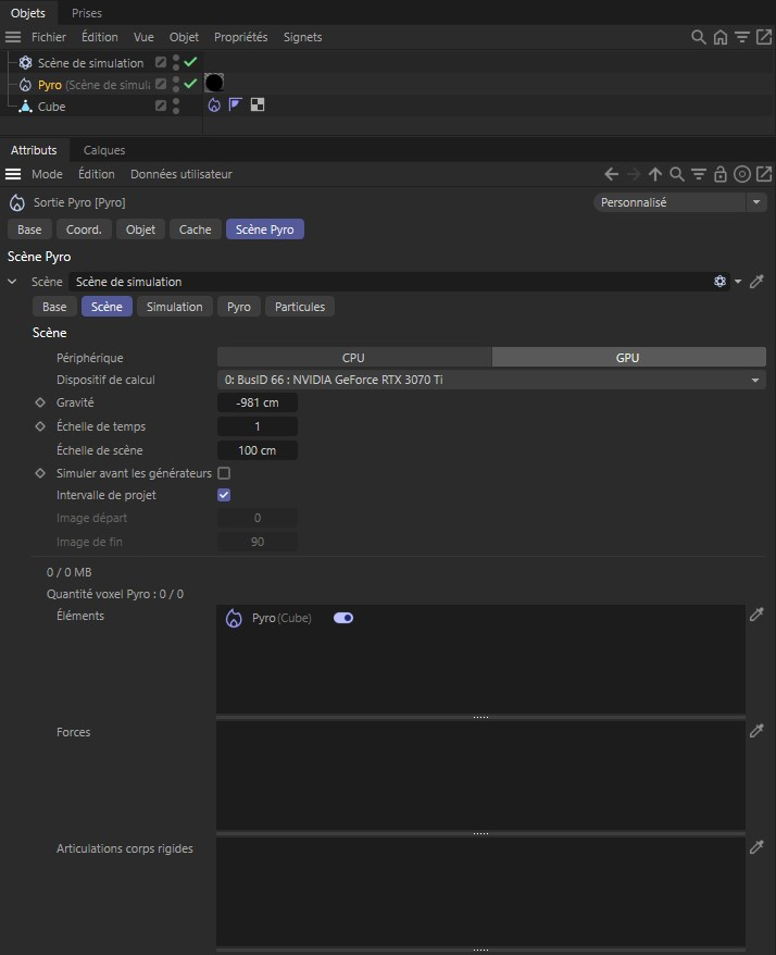 Dans l'objet Sortie Pyro, vous trouverez un lien vers les paramètres de simulation Pyro dans l'onglet Scène Pyro. Vous y trouverez tous les paramètres importants de la simulation, tels que la taille du voxel, déjà mentionnée au début. La propriété Emetteur Pyro n'est responsable que des paramètres de l'émetteur et de la scène Pyro liés à l'objet Sortie Pyro pour le calcul de la simulation réelle.