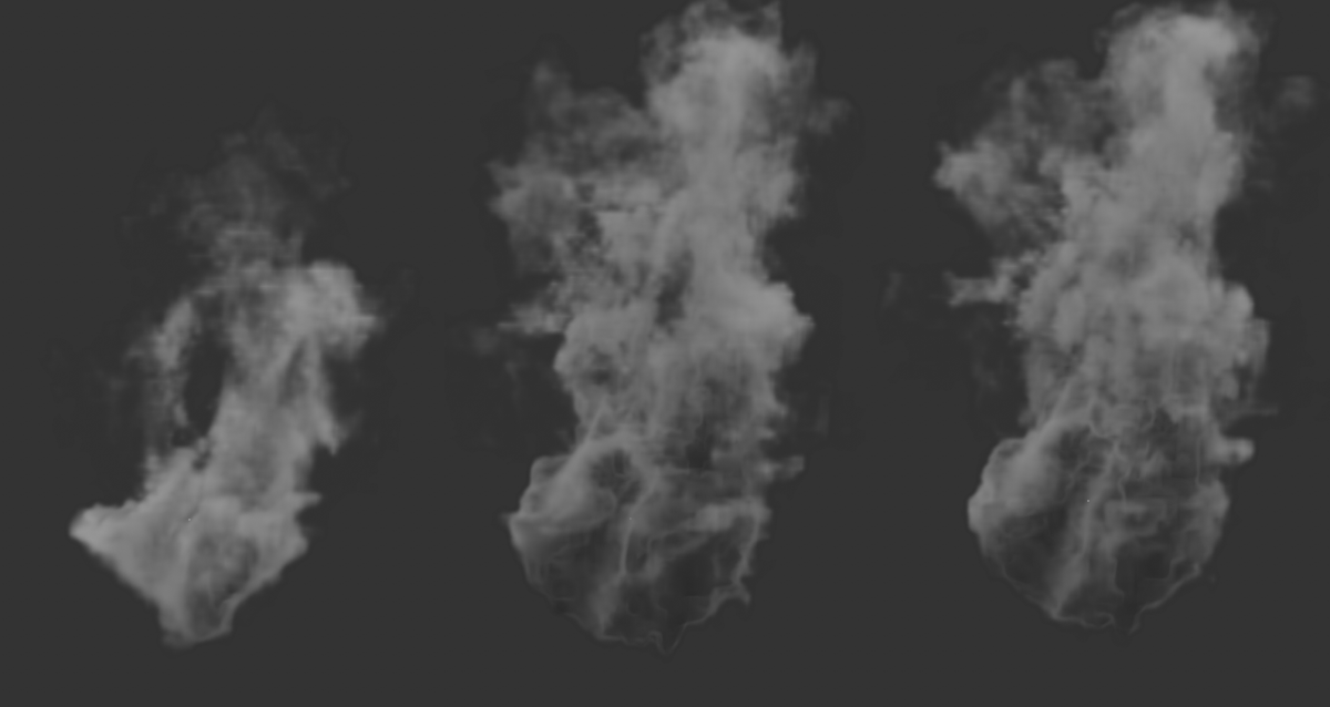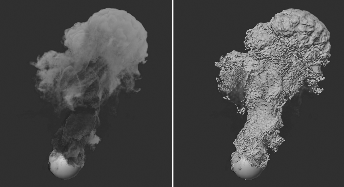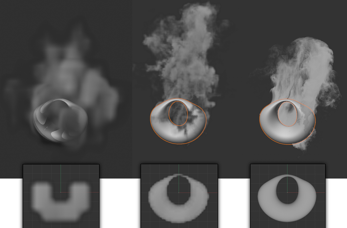 Comme le montre l'image ci-dessus, une forte réduction de la fidélité à l'objet peut conduire à ce que l'objet entier ne soit plus utilisé comme émetteur pyro. Par conséquent, moins de fumée, de gaz chauds ou de carburant sont éjectés. De même, la distribution du gaz généré peut devenir plus inégale, car seules les parties les plus volumineuses de l'objet sont remplies de gaz. Cependant, l'image montre aussi clairement dans cet exemple que les différences peuvent être très faibles dans certains cas. La différence entre les résultats des simulations du centre et de la droite est donc négligeable. Cependant, nous économisons de nombreux voxels en volume.