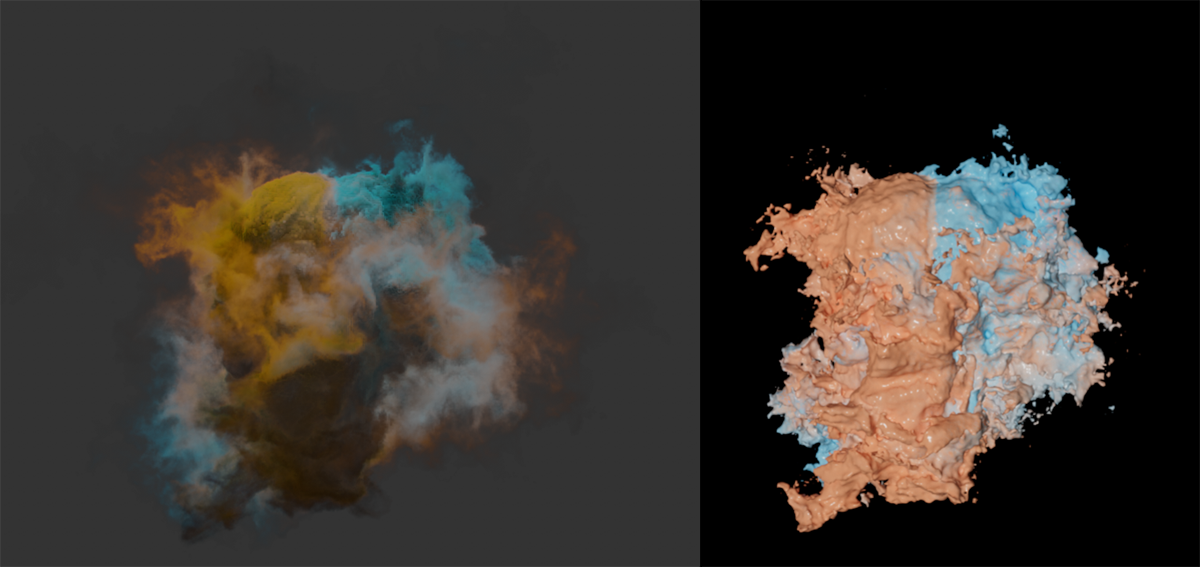 À gauche, vous pouvez voir la simulation Pyro avec la fumée de deux sphères, chaque sphère produisant une fumée de couleur différente. À droite, vous pouvez voir le résultat calculé sous forme de maillage, où vous pouvez également voir les différentes couleurs.