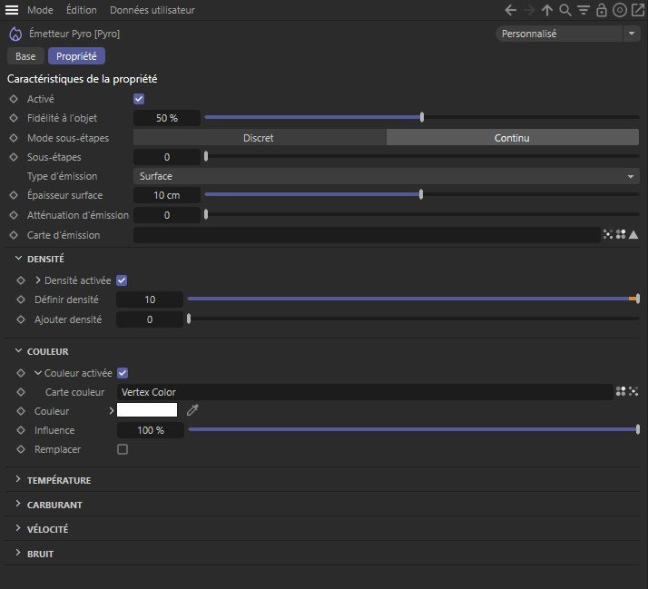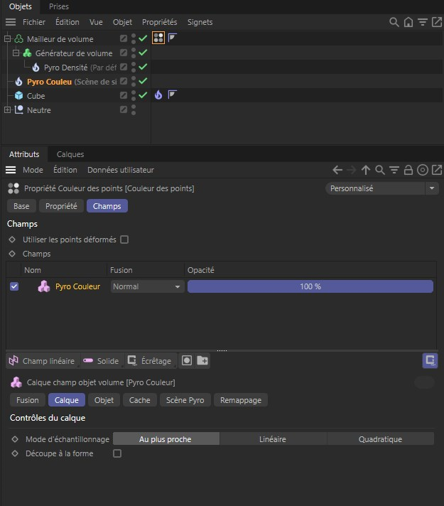 Ajoutez maintenant une propriété Couleur de points au Mailleur de volume. Vous trouverez cette propriété dans le gestionnaire d'objets sous Propriétés/Autres. Dans la section Champsde cette propriété, vous pouvez maintenant assigner l'objet Sortie Pyro qui lit le cache de couleur. Ces informations de couleur sont ainsi attribuées aux différents points du Mailleur de Volume.