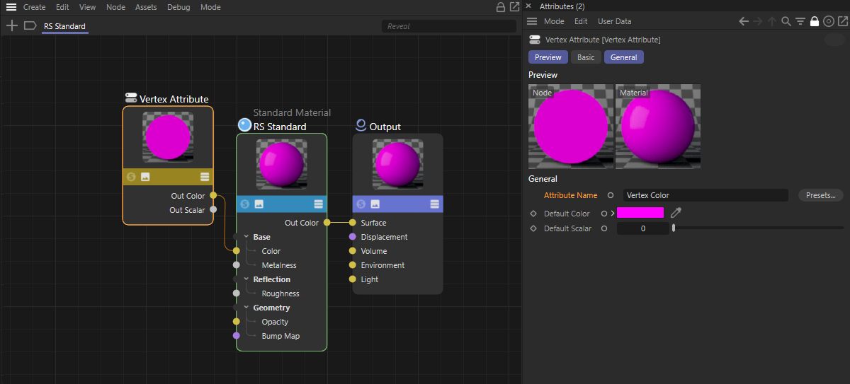 Pour pouvoir utiliser les couleurs de la propriété Couleur des points dans un matériau Redshift, nous utilisons un nœud Vertex Attribute. Dans le champ Attribute Name, il suffit de faire glisser la propriété Couleur des points depuis le gestionnaire d'objets.