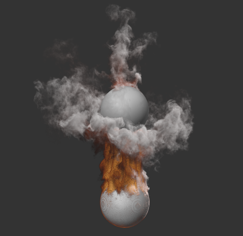 Comme la densité et la température peuvent également être définies négativement (via les paramètres Ajouter densité et Ajouter Température de la propriété Émetteur Pyro), des interactions intéressantes entre plusieurs Émetteur Pyros au sein d'une même scène de simulation Pyro sont également possibles. Par exemple, un objet peut émettre une densité et une température négatives, ce qui permet de dissiper et d'atténuer la chaleur et la densité croissantes d'un autre émetteur. L'image suivante montre un exemple. La sphère supérieure génère alors des propriétés négatives, qui sont pressées sur la sphère inférieure au moyen d'une vitesse dirigée vers le bas. La sphère inférieure génère une densité et une température normales, ce qui lui permet d'être amortie et refroidie lorsque les deux flux gazeux se rencontrent.