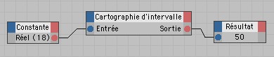 Ce nœud projette une valeur d’un intervalle sur un autre. Supposons que la hauteur d’un objet doive contrôler l’intensité d’une lumière avec un paramètre contrôleur : lorsque l’objet est à 0 m, l’intensité de la lumière doit être de 0 %, et lorsque l’objet est à 2 m, l’intensité doit être de 100 %. Grâce au nœud Cartographie d’intervalle, vous pouvez projeter les valeurs de l’intervalle de 0 à 2 m sur l’intervalle de 0 à 100 %. Dans un tel cas, une hauteur de 1,5 m va correspondre à la valeur 75 %.