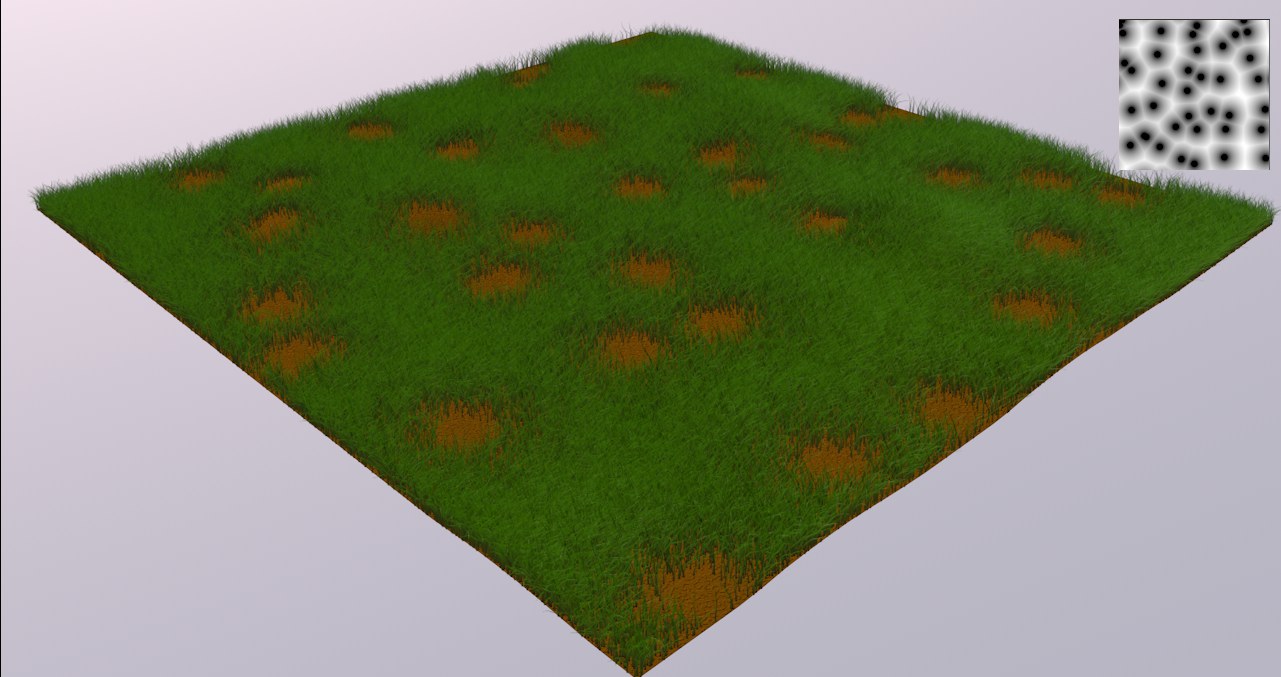Ici, une texture en niveaux de gris peut être chargée, ce qui définira une densité du gazon en relation avec les niveaux de gris de la texture. La densité s’étalera des zones blanches qui possèdent la plus grande densité aux zones noires qui n’en possèdent pas.