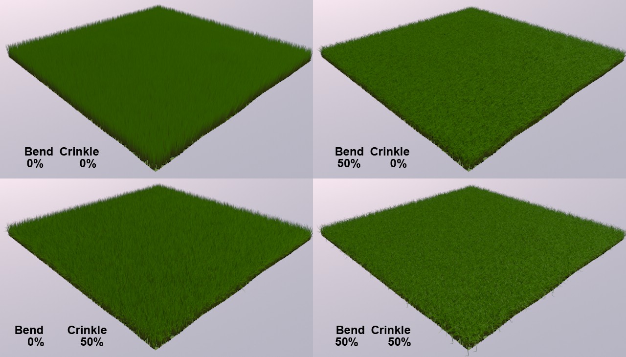 Le paramètre Plier fait se plier les brins de gazon. Plus haute est la valeur, plus les brins se plieront de manière aléatoire dans une seule (!) direction (cela forme un contraste avec le paramètre Plisser qui plissent les brins dans plusieurs directions).