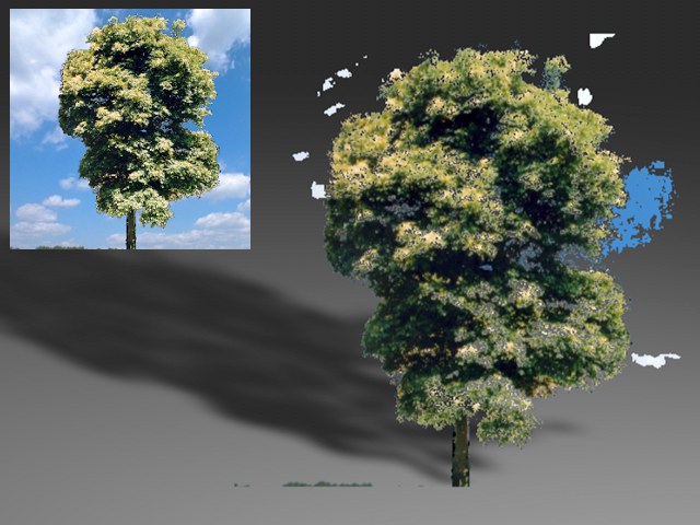 CINEMA 4D ajuste automatiquement les curseurs de couleurs de façon à ce que la vignette de couleur corresponde à la couleur prélevée dans la vignette de prévisualisation, et supprime la couleur en se basant sur l’image. A présent, vous ne devriez voir que l’arbre, sans son fond (si vous avez activé l’ombrage de Gouraud ou l’ombrage rapide dans la vue). Vous pouvez à présent affiner l’effet en sélectionnant une couleur légèrement différente dans la section Alpha (et constater immédiatement la différence). Toutefois, il est possible que certaines parties du fond soient toujours visibles, notamment autour des feuilles, des branches et du tronc. L’effet ne sera donc pas tout à fait réussi.