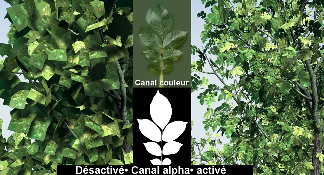 Le principe consiste à définir dans un matériau des zones qui vont "cesser d’exister” de façon à rendre visible le matériau sous-jacent. L’exemple le plus classique est la représentation d’un arbre en 3D. Au lieu de modéliser l’arbre tout entier, vous pouvez affecter l’image d’un arbre comme texture à un objet et utiliser le canal alpha pour détourer l’image de l’arbre et rendre transparentes les zones qui lui sont extérieures.