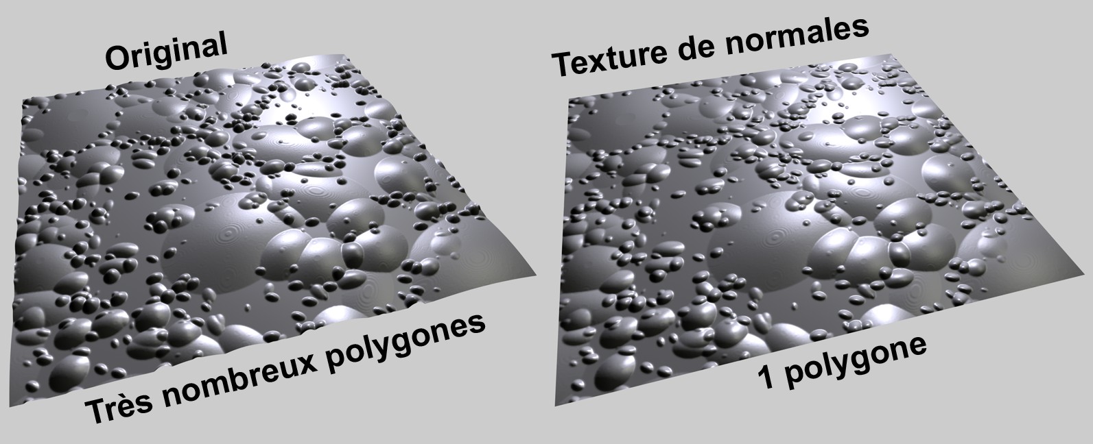 Il s’agit d’une technique provenant du développement de jeu, qui permet de donner à des objets à faible nombre de polygones (de basse précision) une surface à l’apparence structurée et détaillée, et de réduire ainsi la durée du rendu.