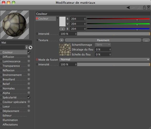 | Affectations | Liste de tous les objets utilisant le matériau |